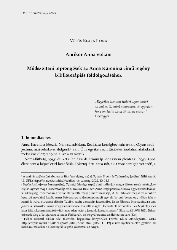 Vörös, Klára Ilona (2022) Amikor Anna voltam : Módszertani töprengések az Anna Karenina című regény biblioterápiás feldolgozásához. In: G. Szabó, Sára és Gombos, Péter (Szerk.) Módszertan és megújulás : Válogatás a MATE Neveléstudományi Intézete szakmódszertani tanulmányaiból. MATE Press, Gödöllő. 120 p. pp. 99-111. ISBN 978-963-623-022-7