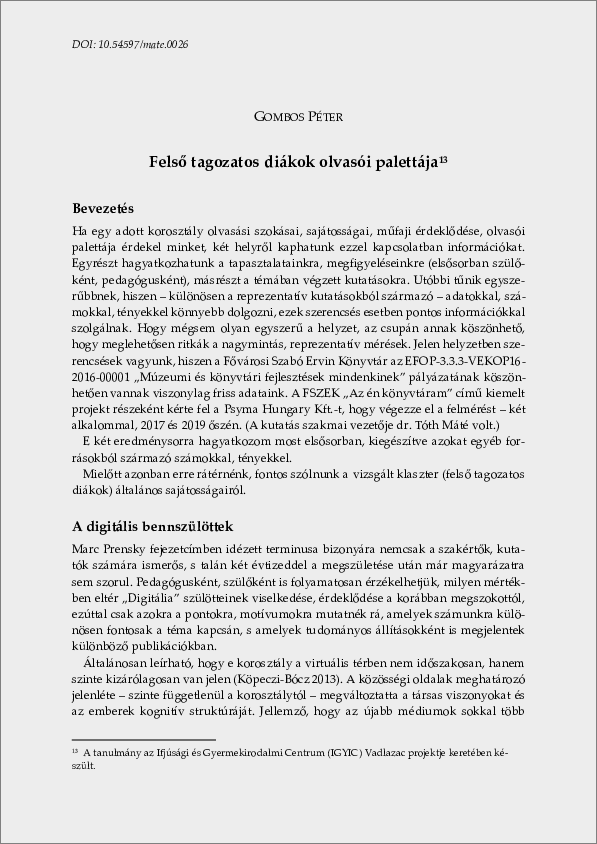 Gombos, Péter (2022) Felső tagozatos diákok olvasói palettája. In: G. Szabó, Sára és Gombos, Péter (Szerk.) Módszertan és megújulás : Válogatás a MATE Neveléstudományi Intézete szakmódszertani tanulmányaiból. MATE Press, Gödöllő. 120 p. pp. 113-120. ISBN 978-963-623-022-7