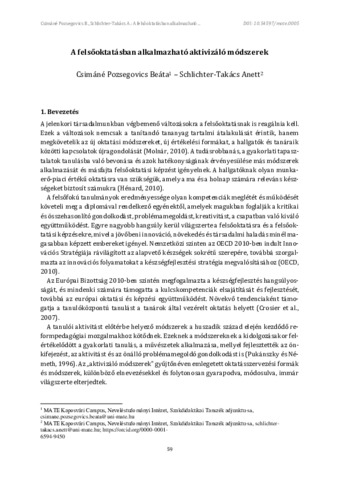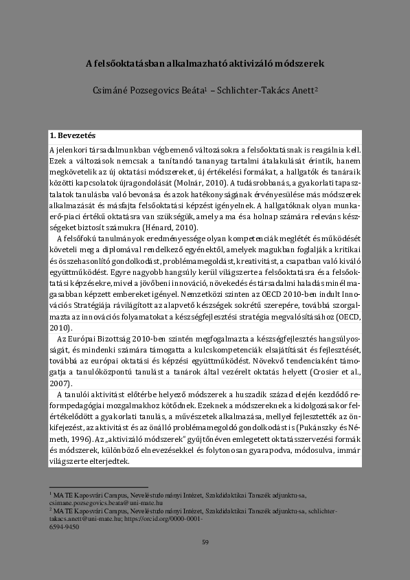 Csimáné Pozsegovics, Beáta és Schlichter-Takács, Anett (2022) A felsőoktatásban alkalmazható aktivizáló módszerek. In: Bencéné Fekete, Andrea és Schlichter Takács, Anett (Szerk.) Módszertani eszköztár a felsőoktatásban tanító oktatók számára. MATE Press, Gödöllő. pp. 59-71. ISBN 978-963-623-017-3