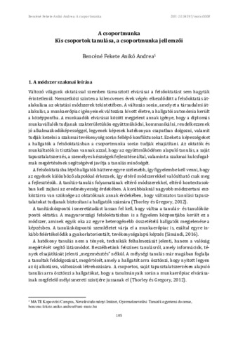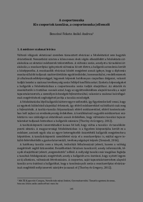 Bencéné Fekete, Anikó Andrea (2022) A csoportmunka : Kis csoportok tanulása, a csoportmunka jellemzői. In: Bencéné Fekete, Andrea és Schlichter Takács, Anett (Szerk.) Módszertani eszköztár a felsőoktatásban tanító oktatók számára. MATE Press, Gödöllő. pp. 105-121. ISBN 978-963-623-017-3