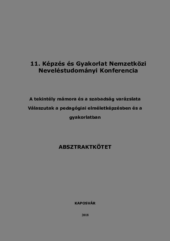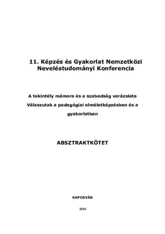 Belovári, Anita és Bencéné Fekete, Andrea és Nagyházi, Bernadette (Szerk.). (2018) 11. Képzés és Gyakorlat Nemzetközi Neveléstudományi Konferencia : A tekintély mámora és a szabadság varázslata. Válaszutak a pedagógiai elméletképzésben és a gyakorlatban : Absztraktkötet. Kaposvári Egyetem Pedagógiai Kar, Kaposvár. 61 p. ISBN 978-615-5599-47-7