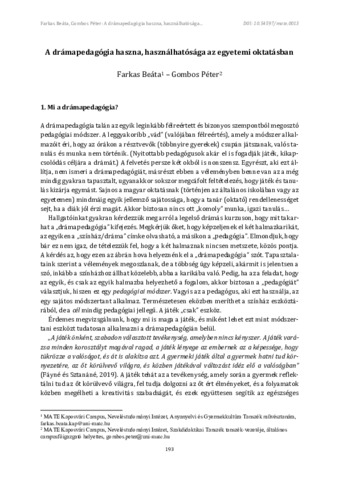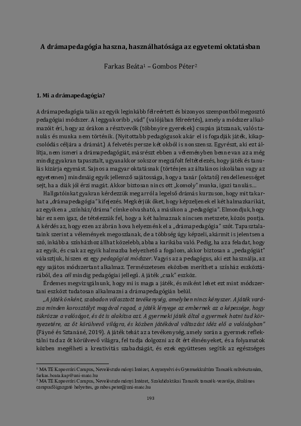 Farkas, Beáta és Gombos, Péter (2022) A drámapedagógia haszna, használhatósága az egyetemi oktatásban. In: Bencéné Fekete, Andrea és Schlichter-Takács, Anett (Szerk.) Módszertani eszköztár a felsőoktatásban tanító oktatók számára. MATE Press, Gödöllő. pp. 193-204. ISBN 978-963-623-017-3
