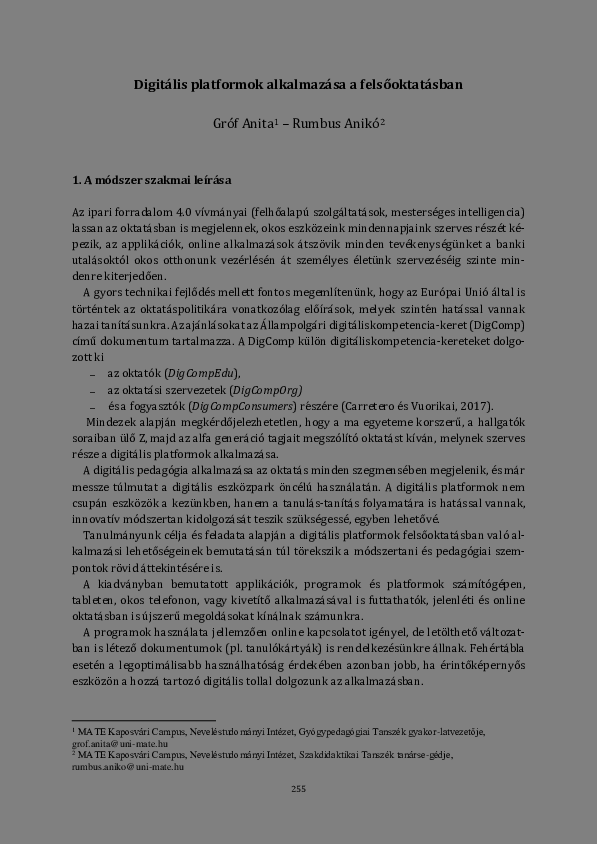 Gróf, Anita és Rumbus, Anikó (2022) Digitális platformok alkalmazása a felsőoktatásban. In: Bencéné Fekete, Andrea és Schlichter-Takács, Anett (Szerk.) Módszertani eszköztár a felsőoktatásban tanító oktatók számára. MATE Press, Gödöllő. pp. 255-276. ISBN 978-963-623-017-3