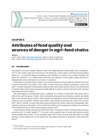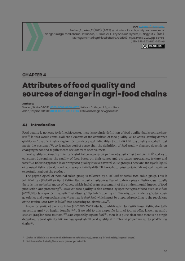 Srečec, Siniša és Jelen, Tatjana (2022) Attributes of food quality and sources of danger in agri-food chains. In: Srečec, Siniša és Csonka, Arnold és Koponicsné Györke, Diána és Nagy, Mónika Zita (Szerk.) Management of agri-food chains. MATE Press, Gödöllő. pp. 55-65. ISBN 978-963-623-023-4