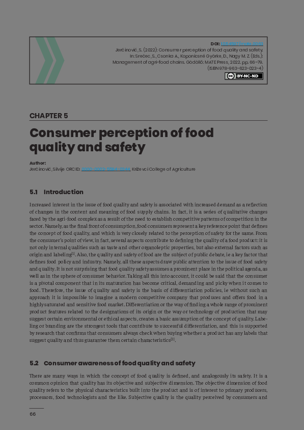Jerčinović, Silvije (2022) Consumer perception of food quality and safety. In: Srečec, Siniša és Csonka, Arnold és Koponicsné Györke, Diána és Nagy, Mónika Zita (Szerk.) Management of agri-food chains. MATE Press, Gödöllő. pp. 66-79. ISBN 978-963-623-023-4