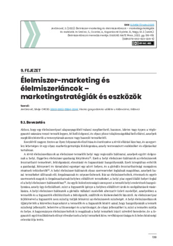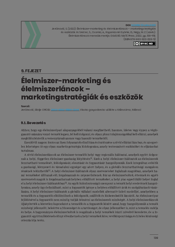 Jerčinović, Silvije (2022) Élelmiszer-marketing és élelmiszerláncok – marketingstratégiák és eszközök. In: Srečec, Sinisa és Csonka, Arnold és Koponicsné Györke, Diána és Nagy, Mónika Zita (Szerk.) Élelmiszerláncok menedzsmentje. MATE Press, Gödöllő. pp. 139-151. ISBN 978-963-623-026-5