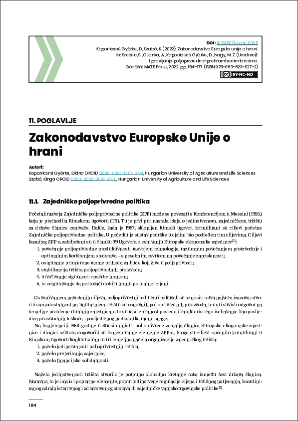 Koponicsné Györke, Diána és Szabó, Kinga (2022) Zakonodavstvo Europske Unije o hrani. In: Srečec, Sinisa és Csonka, Arnold és Koponicsné Györke, Diána és Nagy, Mónika Zita (Szerk.) Upravljanje poljoprivredno-prehrambenim lancima. MATE Press, Gödöllő. ISBN 978-963-623-027-2