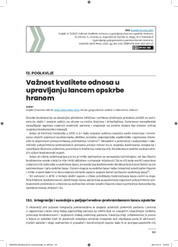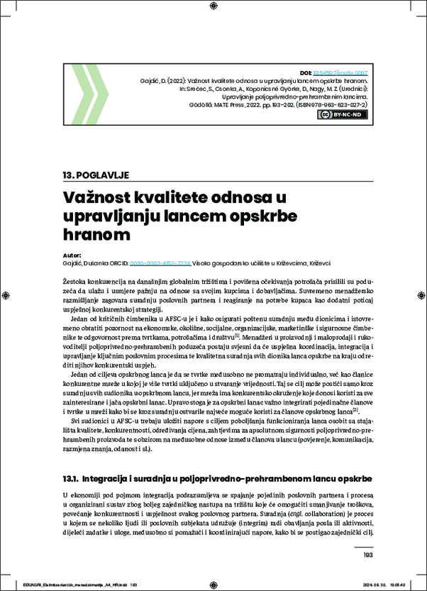 Gajdić, Dušanka (2022) Važnost kvalitete odnosa u upravljanju lancem opskrbe hranom. In: Srečec, Sinisa és Csonka, Arnold és Koponicsné Györke, Diána és Nagy, Mónika Zita (Szerk.) Upravljanje poljoprivredno-prehrambenim lancima. MATE Press, Gödöllő. ISBN 978-963-623-027-2