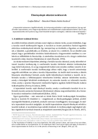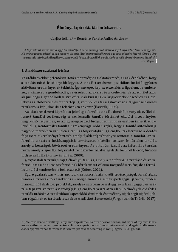Csajka, Edina és Bencéné Fekete, Anikó Andrea (2024) Élményalapú oktatási módszerek. In: Bencéné Fekete, Andrea és Schlichter-Takács, Anett (Szerk.) Módszertani eszköztár a felsőoktatásban tanító oktatók számára 2. MATE Press, Gödöllő. pp. 55-71. ISBN 978-963-623-091-3 (pdf)