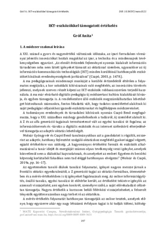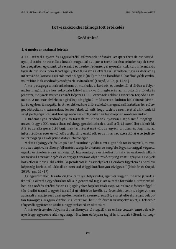 Gróf, Anita IKT-eszközökkel támogatott értékelés. In: Bencéné Fekete, Andrea és Schlichter-Takács, Anett (Szerk.) Módszertani eszköztár a felsőoktatásban tanító oktatók számára 2. MATE Press, Gödöllő. pp. 197-213. ISBN 978-963-623-091-3 (pdf)