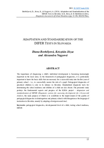 Borbélyová, Diana és Józsa, Krisztián és Nagyová, Alexandra (2024) Adaptation and Standardization of the Difer Tests in Slovakia. In: Józsa, Krisztián és Borbélyová, Diana (Szerk.) Diagnostic Assessment of School Readiness. MATE Press, Gödöllő. pp. 13-30. ISBN 978-963-623-085-2 [PDF] 978-963-623-086-9 [Print]