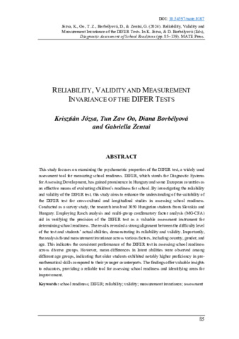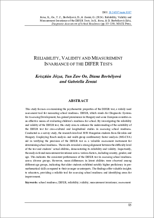 Józsa, Krisztián és Oo, Tun Zaw és Borbélyová, Diana és Zentai, Gabriella (2024) Reliability, Validity and Measurement Invariance of the DIFER Tests. In: Józsa, Krisztián és Borbélyová, Diana (Szerk.) Diagnostic Assessment of School Readiness. MATE Press, Gödöllő. pp. 85-139.