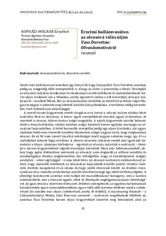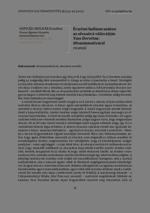 Kopházi-Molnár, Erzsébet (2023) Érzelmi hullámvasúton az olvasóvá válás útján. ANYANYELVI KULTÚRAKÖZVETÍTÉS, 6 (2). pp. 45-46. ISSN 2063-2991