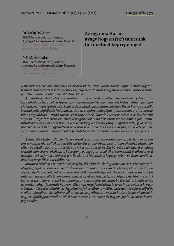 Domokos, Áron és Molnár, Gábor (2022) Az ügynök: Harari, avagy hogyan (ne) tanítsunk történelmet képregénnyel : Első rész. ANYANYELVI KULTÚRAKÖZVETÍTÉS, 5 (2). pp. 49-68. ISSN 2063-2991