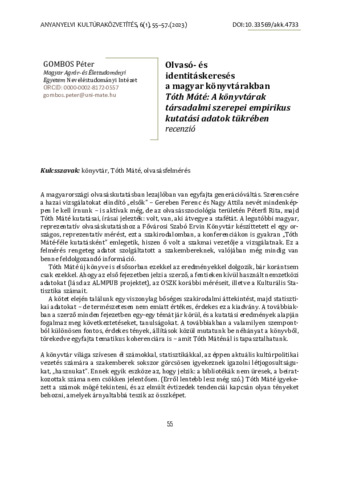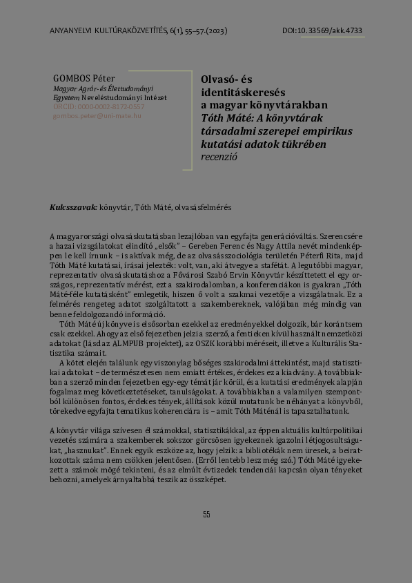 Gombos, Péter (2023) Olvasó- és identitáskeresés a magyar könyvtárakban. ANYANYELVI KULTÚRAKÖZVETÍTÉS, 6 (1). pp. 55-57. ISSN 2063-2991