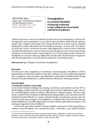 Belovári, Anita (2022) Tömegkultúra és nemzeti identitás : A hősiesség mintázatai az Egri Csillagok és a Great Battle (안시성 = Ansisang) című dél-koreai filmben. ANYANYELVI KULTÚRAKÖZVETÍTÉS, 5 (2). pp. 82-96. ISSN 2063-2991