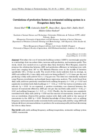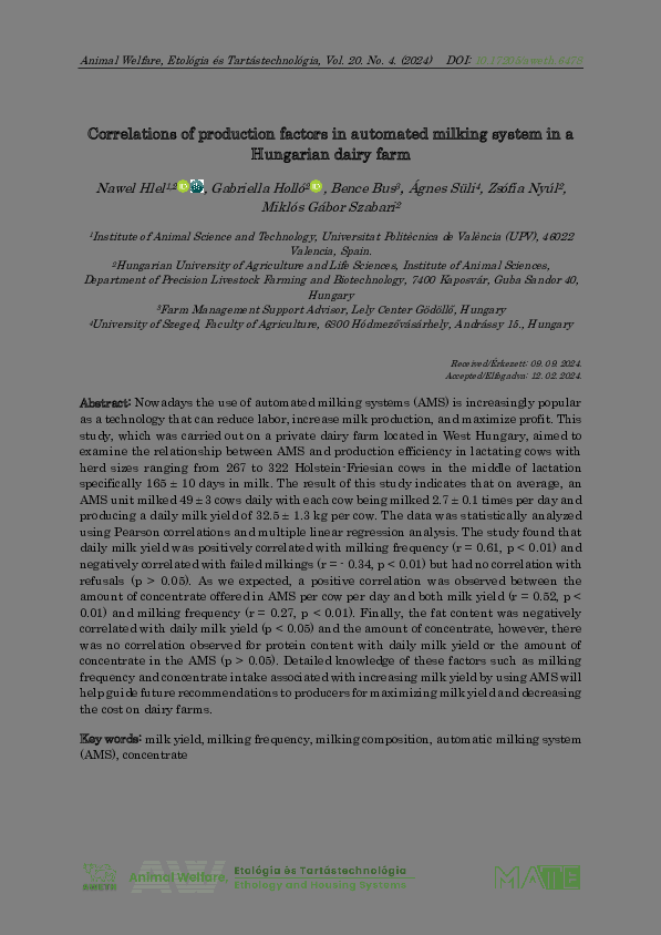 Hlel, Nawel és Holló, Gabriella és Bus, Bence és Süli, Ágnes és Nyúl, Zsófia és Szabari, Miklós (2024) Correlations of production factors in automated milking system in a Hungarian dairy farm. ANIMAL WELFARE ETOLÓGIA ÉS TARTÁSTECHNOLÓGIA / ANIMAL WELFARE ETHOLOGY AND HOUSING SYSTEMS, 20 (2). pp. 131-145. ISSN 1786-8440
