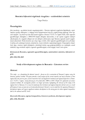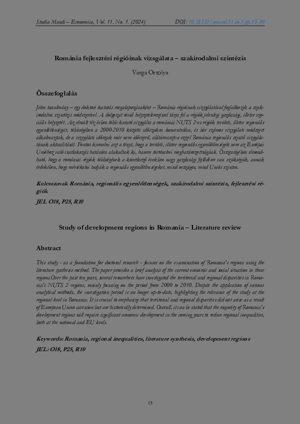 Varga, Orsolya (2024) Románia fejlesztési régióinak vizsgálata – szakirodalmi szintézis. STUDIA MUNDI - ECONOMICA, 11 (1). pp. 15-30. ISSN 2415-9395