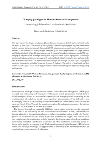 Makalima, Mzuchumile és Rudnák, Ildikó (2024) Changing paradigms in Human Resource Management : Harmonizing global trends and local realities in South Africa. STUDIA MUNDI - ECONOMICA, 11 (1). pp. 31-42. ISSN 2415-9395