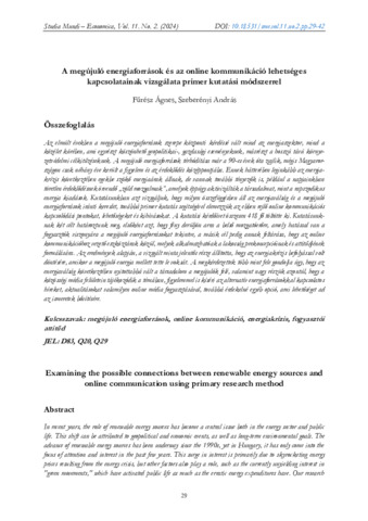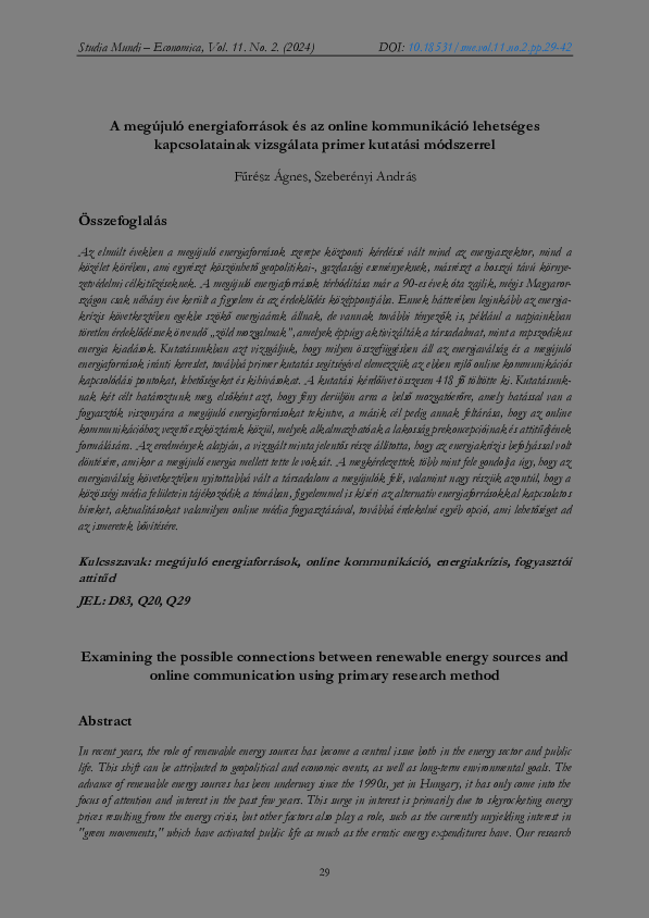 Fűrész, Ágnes és Szeberényi, András (2024) A megújuló energiaforrások és az online kommunikáció lehetséges kapcsolatainak vizsgálata primer kutatási módszerrel. STUDIA MUNDI - ECONOMICA, 11 (2). pp. 29-42. ISSN 2415-9395