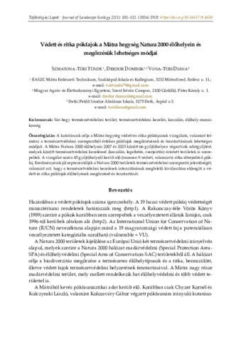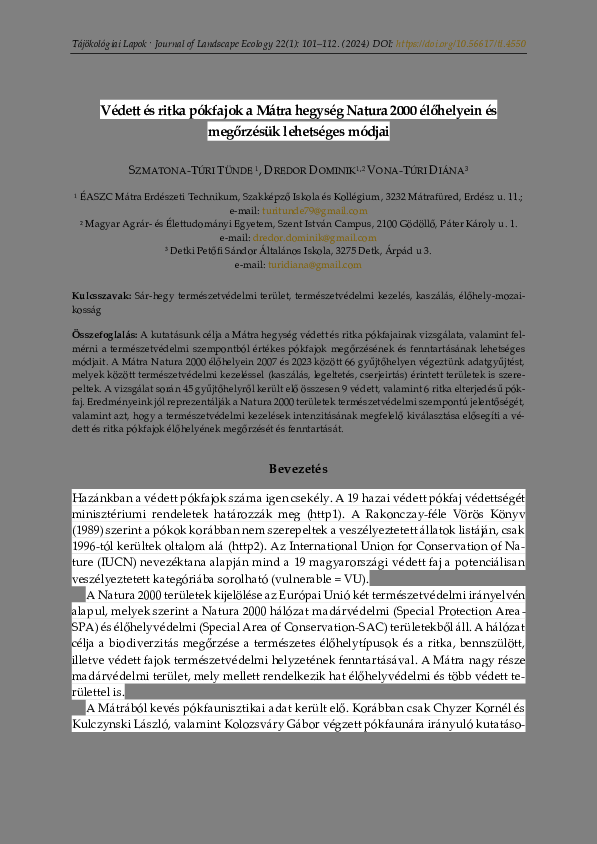 Szmatona-Túri, Tünde és Dredor, Dominik és Vona-Túri, Diána (2024) Védett és ritka pókfajok a Mátra hegység Natura 2000 élőhelyein és megőrzésük lehetséges módjai [Rare and threatened spider species in the Natura 2000 habitats of the Mátra Mountains in Hungary and possible strategies of their conservation]. TÁJÖKOLÓGIAI LAPOK, 22 (1). pp. 101-112. ISSN 1589-4673