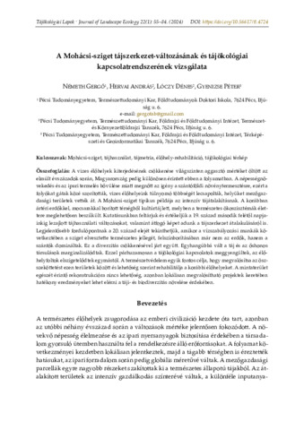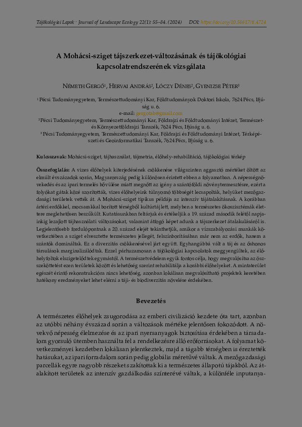 Németh, Gergő és Hervai, András és Lóczy, Dénes és Gyenizse, Péter (2024) A Mohácsi-sziget tájszerkezet-változásának és tájökológiai kapcsolatrendszerének vizsgálata [Landscape pattern change and landscape ecological connectivity on Mohács island]. TÁJÖKOLÓGIAI LAPOK, 22 (1). pp. 55-84. ISSN 1589-4673