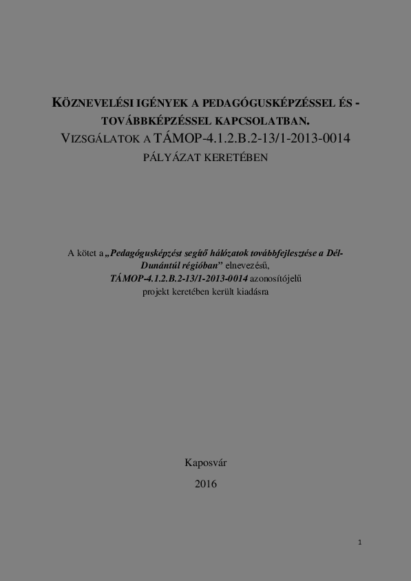 Fináncz, Judit (2016) Köznevelési igények a pedagógusképzéssel és -továbbképzéssel kapcsolatban : Vizsgálatok a TÁMOP-4.1.2.B.2-13/1-2013-0014 pályázat keretében. Kaposvári Egyetem Pedagógiai Kar, Kaposvár. 111 p. ISBN 978-615-5599-29-3