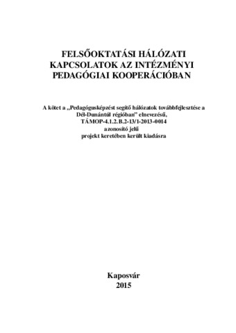 Bencéné Fekete, Andrea (Szerk.). (2015) Felsőoktatási hálózati kapcsolatok az intézményi pedagógiai kooperációban. Kaposvári Egyetem Pedagógiai Kara, Kaposvár. 70 p. ISBN 978-963-9821-88-0