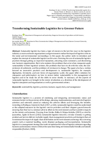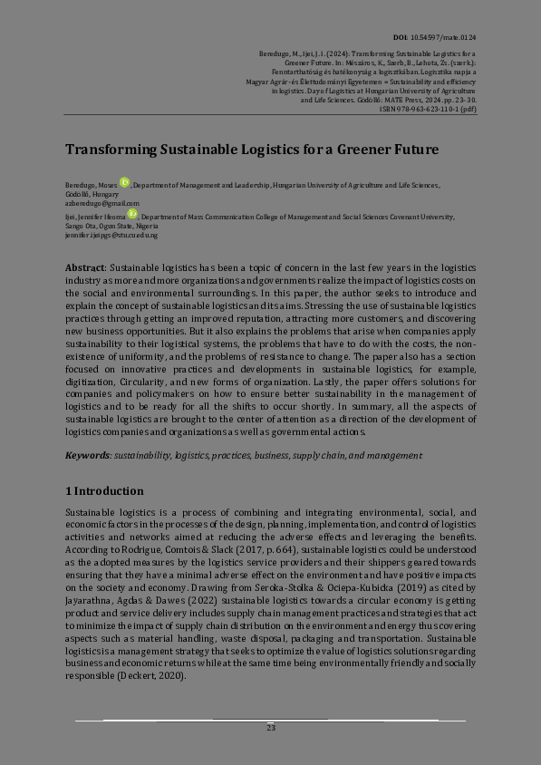 Beredugo, Moses és Ijei, Jennifer Ifeoma (2024) Transforming Sustainable Logistics for a Greener Future. In: Mészáros, Kornélia és Szerb, Boglárka és Lehota, Zsuzsanna (Szerk.) Fenntarthatóság és hatékonyság a logisztkában. Logisztika napja a Magyar Agrár- és Élettudományi Egyetemen = Sustainability and efficiency in logistics. Day of Logistics at Hungarian University of Agriculture and Life Sciences. MATE Press, Gödöllő. pp. 23-30. ISBN 978-963-623-110-1 (pdf)