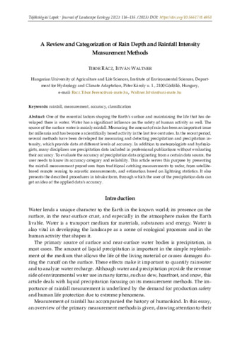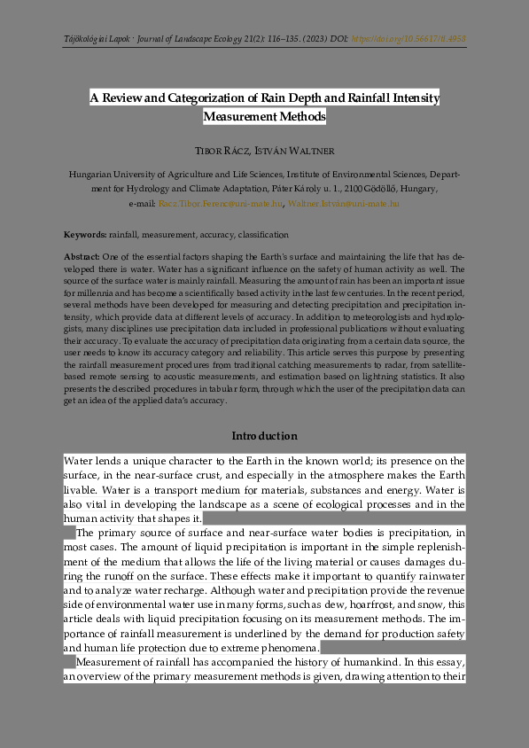 Rácz, Tibor Ferenc és Waltner, István (2023) A Review and Categorization of Rain Depth and Rainfall Intensity Measurement Methods. TÁJÖKOLÓGIAI LAPOK / JOURNAL OF LANDSCAPE ECOLOGY, 21 (2). pp. 116-135. ISSN 1589-4673