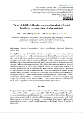 Doma-Tarcsányi, Judit és Dragán, Petra és Szabó, Krisztina (2025) Városi zöldfelületek ökoszisztéma-szolgáltatásainak fejlesztési lehetőségei lágyszárú növények alkalmazásával. In: Centeri, Csaba és Grónás, Viktor (Szerk.) Az Európai Zöld Megállapodás stratégiai céljainak megvalósítását szolgáló tájléptékű megoldások. MATE Press, Gödöllő. pp. 45-50. ISBN 978-963-623-117-0 (pdf)