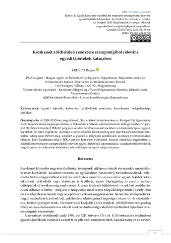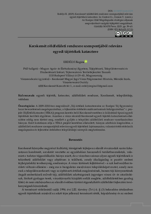 Erdélyi, Regina (2025) Kecskemét zöldfelületi rendszere szempontjából releváns egyedi tájértékek katasztere. In: Centeri, Csaba és Grónás, Viktor (Szerk.) Az Európai Zöld Megállapodás stratégiai céljainak megvalósítását szolgáló tájléptékű megoldások. MATE Press, Gödöllő. pp. 59-63. ISBN 978-963-623-117-0 (pdf)