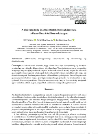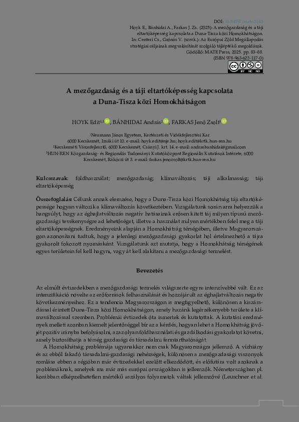 Hoyk, Edit és Bánhidai, András és Farkas, Jenő Zsolt (2025) A mezőgazdaság és a táji eltartóképesség kapcsolata a Duna-Tisza közi Homokhátságon. In: Centeri, Csaba és Grónás, Viktor (Szerk.) Az Európai Zöld Megállapodás stratégiai céljainak megvalósítását szolgáló tájléptékű megoldások. MATE Press, Gödöllő. pp. 83-88. ISBN 978-963-623-117-0 (pdf)