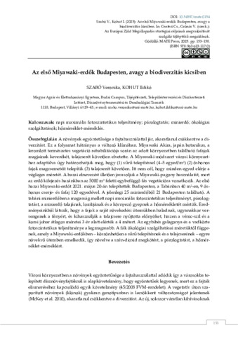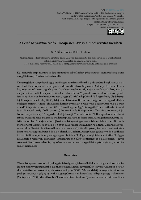 Szabó, Veronika és Kohut, Ildikó (2025) Az első Miyawaki-erdők Budapesten, avagy a biodiverzitás kicsiben. In: Centeri, Csaba és Grónás, Viktor (Szerk.) Az Európai Zöld Megállapodás stratégiai céljainak megvalósítását szolgáló tájléptékű megoldások. MATE Press, Gödöllő. pp. 153-158. ISBN 978-963-623-117-0 (pdf)