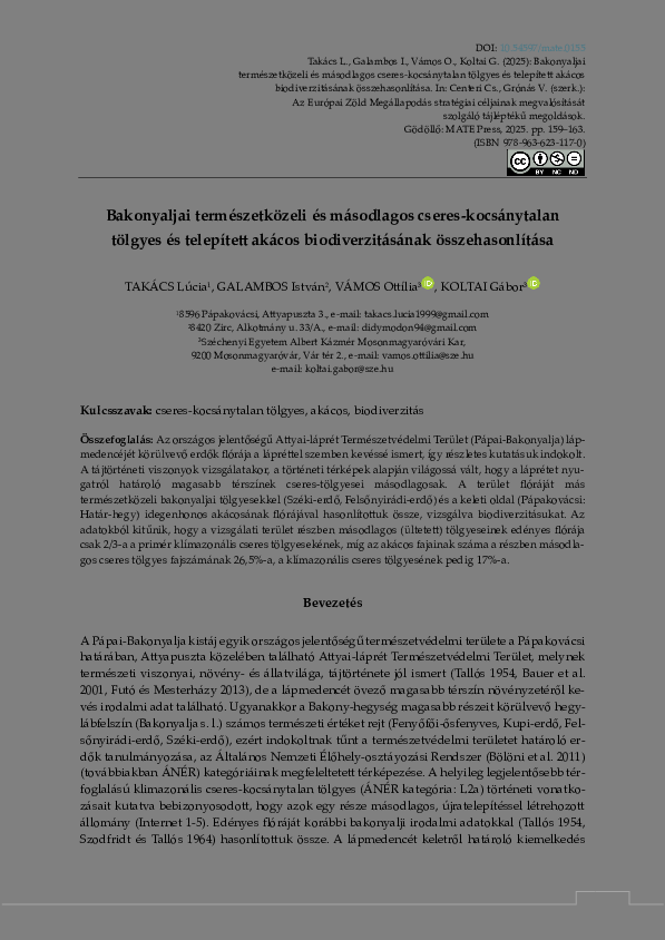 Takács, Lúcia és Galambos, István és Vámos, Ottília és Koltai, Gábor (2025) Bakonyaljai természetközeli és másodlagos cseres-kocsánytalan tölgyes és telepített akácos biodiverzitásának összehasonlítása. In: Centeri, Csaba és Grónás, Viktor (Szerk.) Az Európai Zöld Megállapodás stratégiai céljainak megvalósítását szolgáló tájléptékű megoldások. MATE Press, Gödöllő. pp. 159-163. ISBN 978-963-623-117-0 (pdf)
