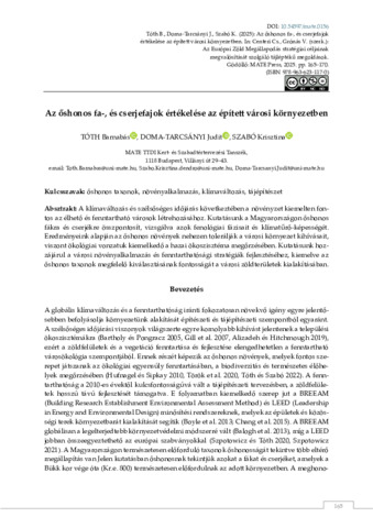 Tóth, Barnabás és Doma-Tarcsányi, Judit és Szabó, Krisztina (2025) Az őshonos fa-, és cserjefajok értékelése az épített városi környezetben. In: Centeri, Csaba és Grónás, Viktor (Szerk.) Az Európai Zöld Megállapodás stratégiai céljainak megvalósítását szolgáló tájléptékű megoldások. MATE Press, Gödöllő. pp. 165-170. ISBN 978-963-623-117-0 (pdf)
