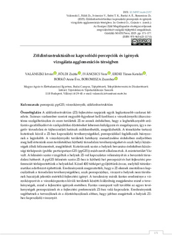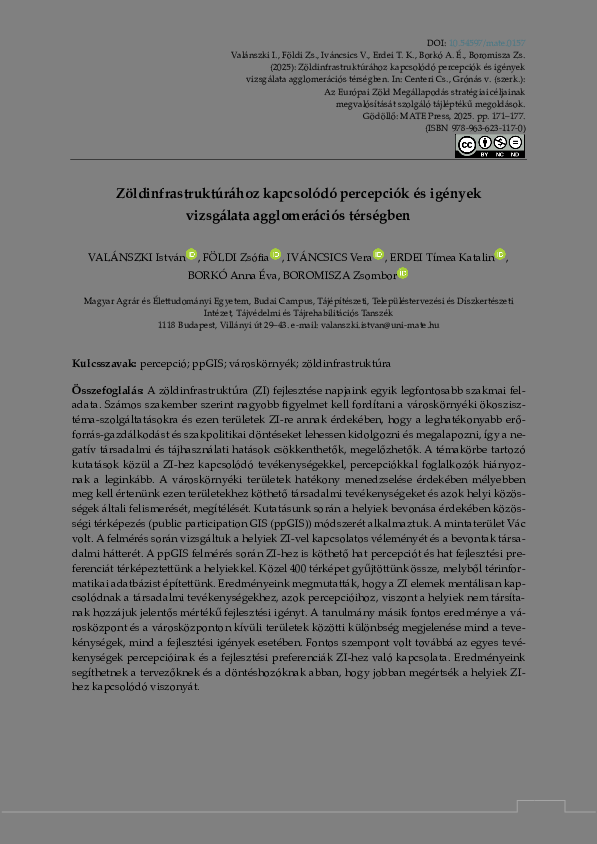 Valánszki, István és Földi, Zsófia és Iváncsics, Vera és Erdei, Tímea Katalin és Borkó, Anna Éva és Boromisza, Zsombor (2025) Zöldinfrastruktúrához kapcsolódó percepciók és igények vizsgálata agglomerációs térségben. In: - (Szerk.) Az Európai Zöld Megállapodás stratégiai céljainak megvalósítását szolgáló tájléptékű megoldások. MATE Press, Gödöllő. pp. 171-177. ISBN 978-963-623-117-0 (pdf)