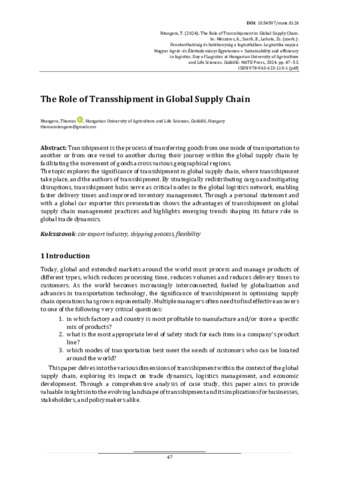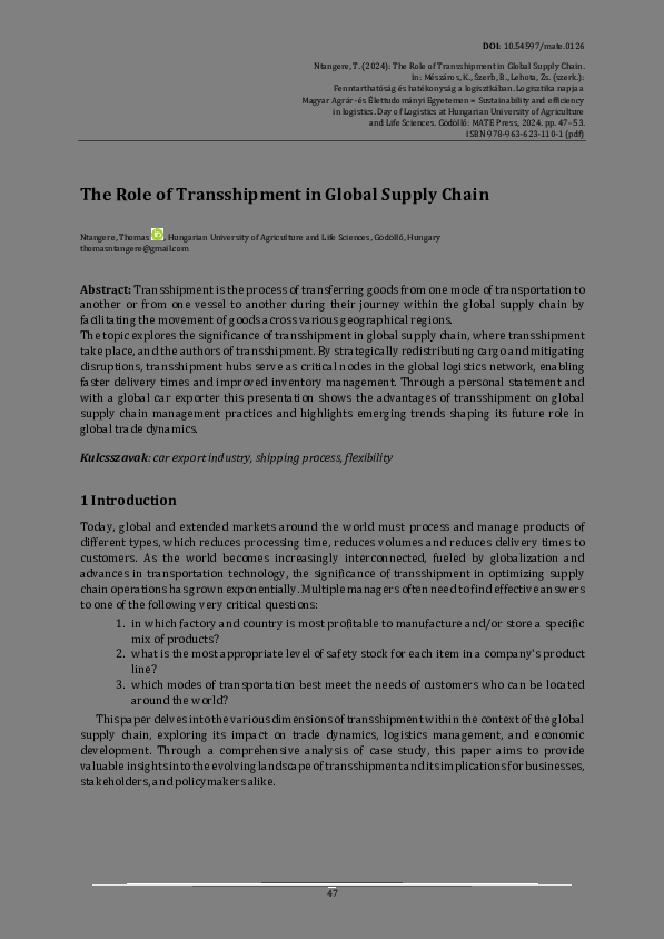 Ntangere, Thomas (2024) The Role of Transshipment in Global Supply Chain. In: Mészáros, Kornélia és Szerb, Boglárka és Lehota, Zsuzsanna (Szerk.) Fenntarthatóság és hatékonyság a logisztikában : Logisztika napja a Magyar Agrár- és Élettudományi Egyetemen, Gödöllő, 2023. április 20. és 2024. április 23. = Sustainability and efficiency in logistics : Day of Logistics at Hungarian University of Agricu. MATE Press, Gödöllő. pp. 47-53. ISBN 978-963-623-110-1 (pdf)