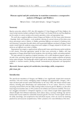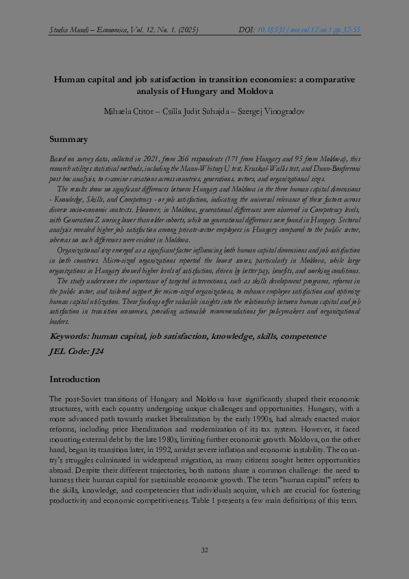 Ctitor, Mihaela és Suhajda, Csilla Judit és Vinogradov, Szergej (2025) Human capital and job satisfaction in transition economies: a comparative analysis of Hungary and Moldova. STUDIA MUNDI - ECONOMICA, 12 (1). pp. 32-55. ISSN 2415-9395