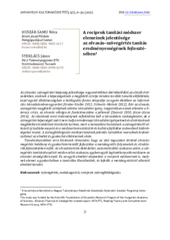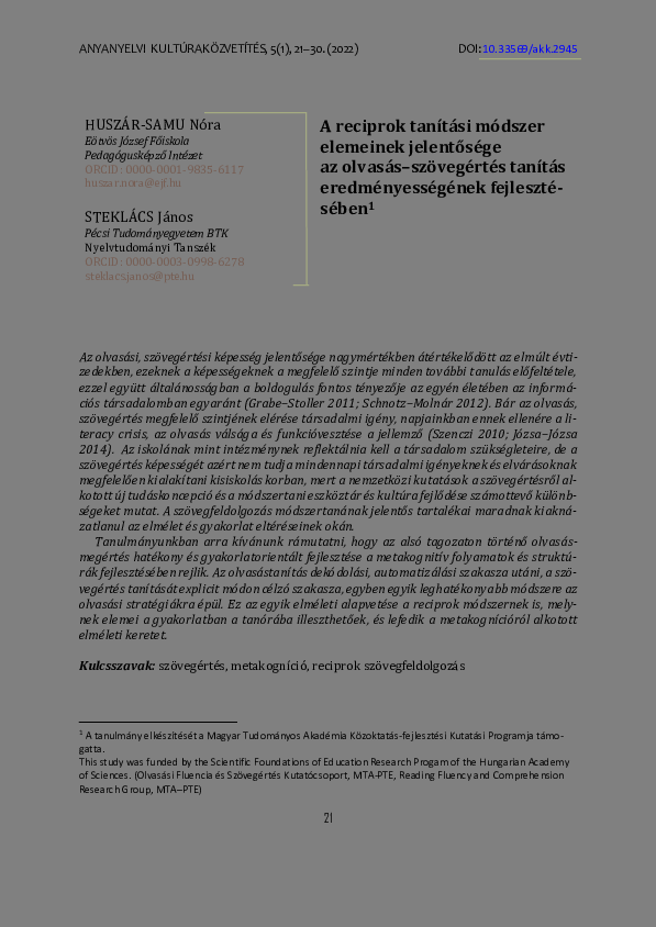 Huszár-Samu, Nóra és Steklács, János (2022) A reciprok tanítási módszer elemeinek jelentősége az olvasás–szövegértés tanítás eredményességének fejlesztésében. Anyanyelvi Kultúraközvetítés, 5 (1). pp. 21-30. ISSN 2063-2991