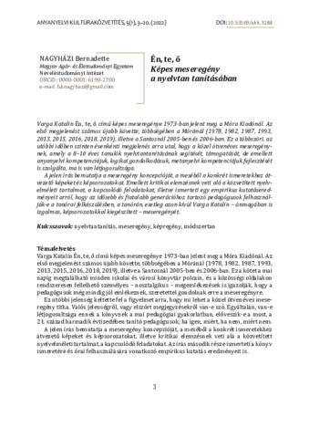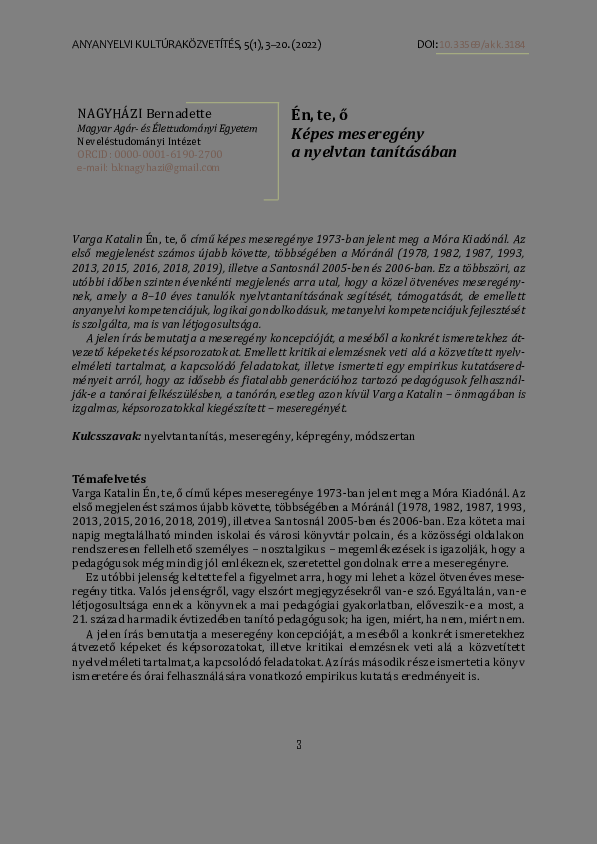 Nagyházi, Bernadette (2022) Én, te, ő – képes meseregény a nyelvtan tanításában. Anyanyelvi Kultúraközvetítés, 5 (1). pp. 3-20. ISSN 2063-2991
