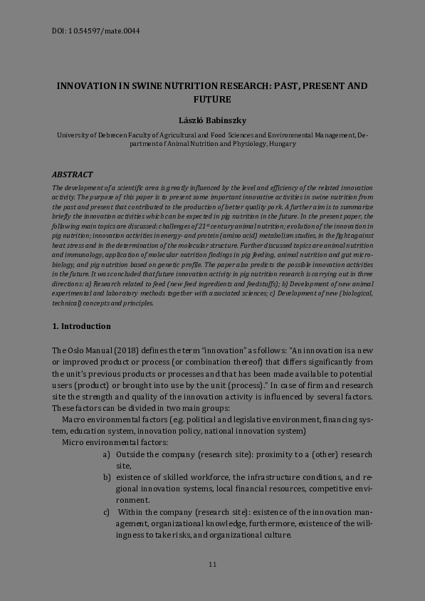 | Kivonat, rövid leírás: | The development of a scientific area is greatly influenced by the level and efficiency of the related innova-tion activity. The purpose of this paper is to present some important innovative activities in swine nutrition from the past and present that contributed to the production of better quality pork. A further aim is to summarize briefly the innovation activities which can be expected in pig nutrition in the future. In the pre-sent paper, the following main topics are discussed: challenges of 21st century animal nutrition; evolution of the innovation in pig nutrition; innovation activities in energy- and protein (amino acid) metabolism stud-ies, in the fight against heat stress and in the determination of the molecular structure. Further discussed topics are animal nutrition and immunology, application of molecular nutrition findings in pig feeding, animal nutrition and gut microbiology, and pig nutrition based on genetic profile. The paper also predicts the possible innovation activities in the future. It was concluded that future innovation activity in pig nutri-tion research is carrying out in three directions: a) Research related to feed (new feed ingredients and feedstuffs); b) Development of new animal experimental and laboratory methods together with associated sciences; c) Development of new (biological, technical) concepts and principles |